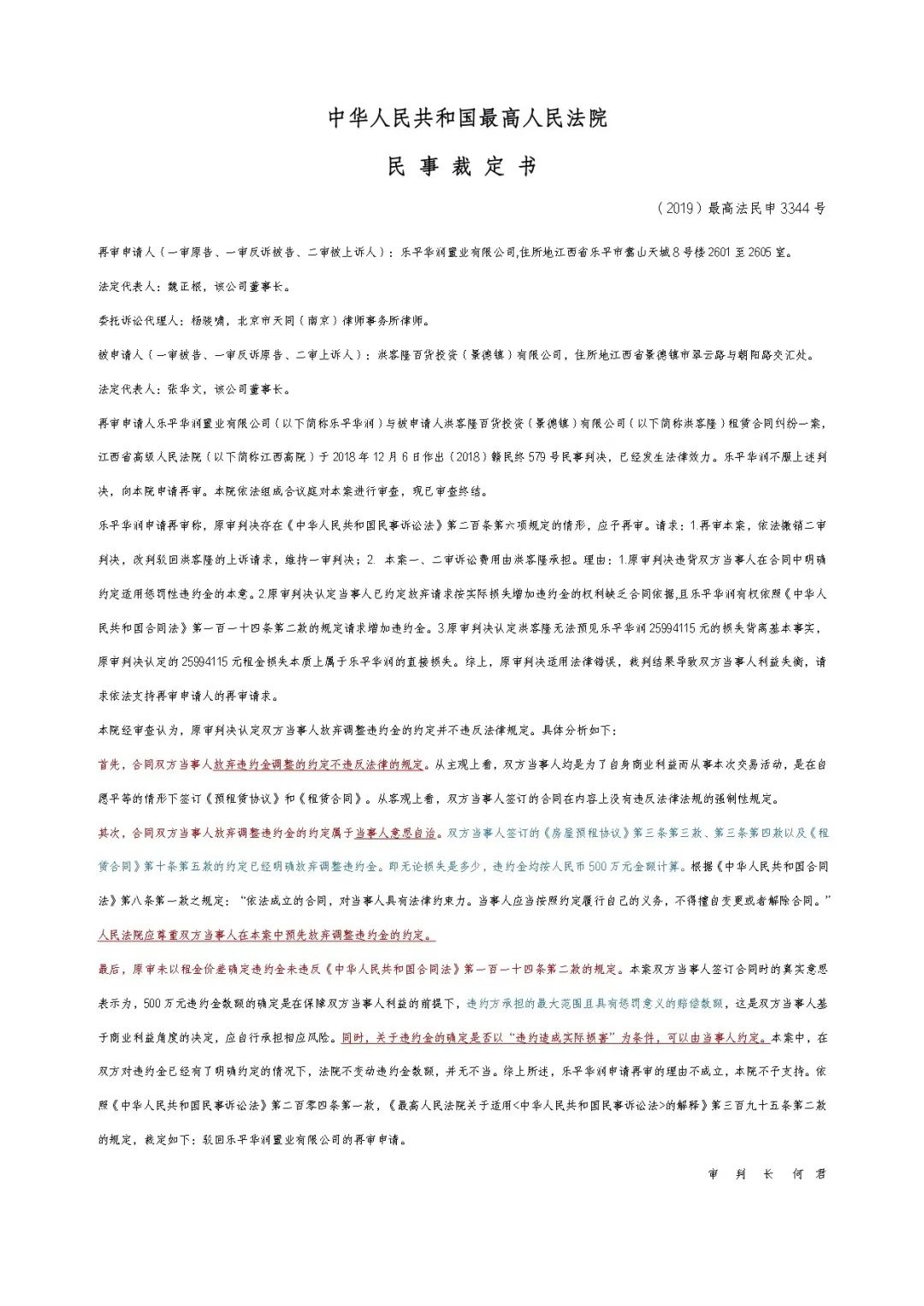 華潤公司與洪客隆百貨租賃合同糾紛一案由江西省高級人民法院(以下簡稱“江西高院”)作出(2018)贛民終579號民事判決書結案,判決已生效,華潤公司不服江西高院的生效判決,向最高人民法院申請再審。最高人民法院于2019年8月30日作出(2019)最高法民申3344號民事裁定書,駁回了華潤公司的再審申請。