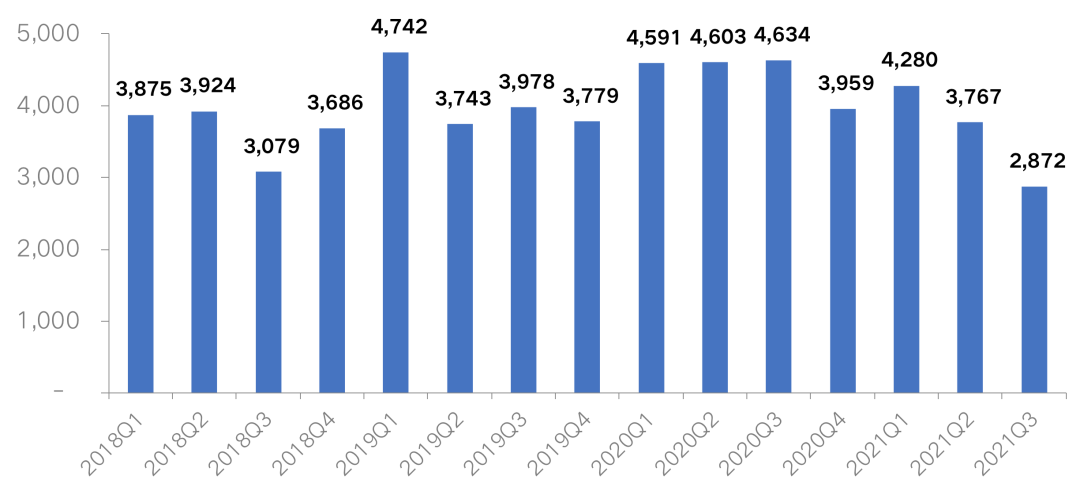 據(jù)不完全統(tǒng)計,2021年前9月100家典型房企的融資量為10919億元,同比下降21%。其中,第三季度的融資額為2872億元,同比下降38%,環(huán)比下降24%,融資額創(chuàng)2018年以來的最低水平。
