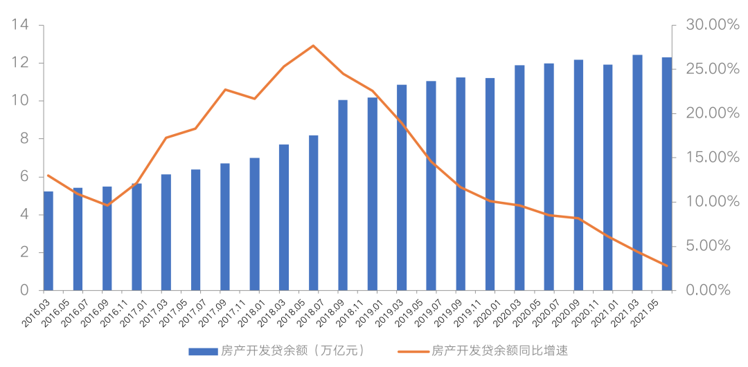 在房地產(chǎn)貸款集中度管理制度的影響下,房企的銀行貸款融資增速持續(xù)走低。銀保監(jiān)會公布的數(shù)據(jù)顯示,截至7月末,銀行業(yè)房地產(chǎn)貸款余額同比增長8.7%,增速創(chuàng)8年新低,低于其他各項貸款增速3個百分點;此外,根據(jù)央行公布的數(shù)據(jù),2021年二季度末房地產(chǎn)開發(fā)貸余額12.3萬億元,同比增速2.8%,增速同樣也是近10年來的新低。