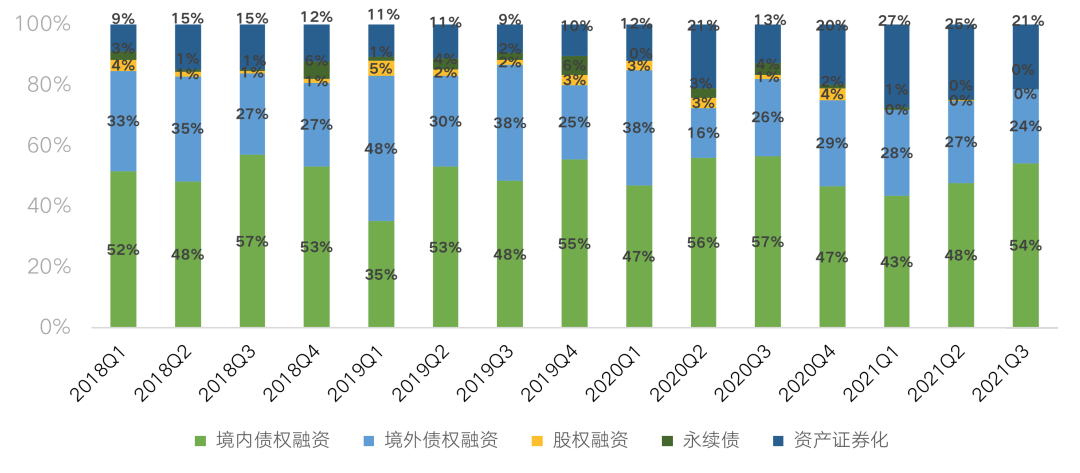 從融資結(jié)構(gòu)來看,2021年前9月,境內(nèi)債權(quán)融資占比為50%,同比下降了3個百分點,境外債權(quán)融資占比為28%,同比微增1個百分點,資產(chǎn)證券化融資占比則同比增長了7個百分點至22%。分季度來看,第三季度境內(nèi)債權(quán)融資占比最大,同比下降了3個百分點至54%,環(huán)比上升了6個百分點;而境外債權(quán)融資占比為24%,同比下降了2個百分點,環(huán)比下降了3個百分點,三季度美元債市場波動較大,房企沒有融資窗口期,房企進(jìn)行境外融資較為謹(jǐn)慎。