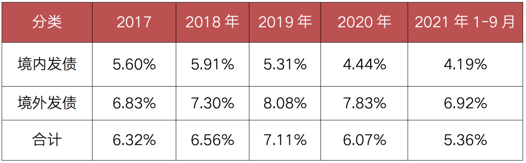 表:2017-2021年9月房企境內(nèi)外債券融資成本