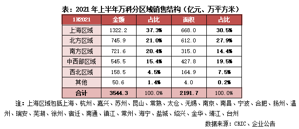 2021年上半年,萬科累計實現合同銷售金額3544.3億元,銷售面積2191.7萬平方米,分別同比增長10.6%和5.5%;銷售均價16171元/平方米,較往年略有提升。上半年,萬科在全國38個城市市場銷售排名位列前三,其中在19個城市市場排名第一,在17個城市排名第二。分區域結構來看,上半年對萬科業績貢獻最高的上海區域實現銷售金額1322.2億元,銷售金額和面積占比分別達到了37.3%和30.5%,北方區域和南方區域的銷售業績貢獻度也均超過20%。