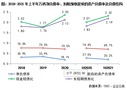 萬科長期堅持穩健的財務政策,截至2021年上半年末,萬科持有貨幣資金1952.2億元,有息負債總額2687.1億元,較去年同期基本持平;現金短債比2.32、長短期債務比2.19;凈負債率20.2%,長期控制在40%以下的水平;扣除預收款項的資產負債率69.7%,負債結構健康、滿足“三道紅線”要求的“綠檔”企業標準。同時,萬科繼續保持了行業領先的信用評級,標普、穆迪、惠譽以及中誠信均給出了“穩定”的評級展望。