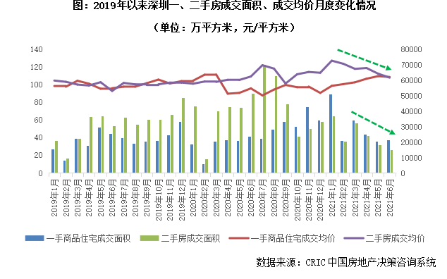 事實上,對于二手房價的管控,上海并非“第一個吃蟹人”,深圳、寧波、成都、西安都在今年出臺了相關政策來打擊“二手房價格虛高、投機炒作”等行為。為了更好的測度上海新政落地的影響,下面我們就以出臺政策最早,和上海最為類似的一線城市深圳為例,來具體看看其在“二手房指導價”出臺對樓市的影響。2月28日,深圳將全市3595個住宅小區作為區域網格單元,以二手住宅網簽價格為基礎,參考周邊一手住房價格,落實參考價格制度;旨在以二手住房交易信息公開透明為主要抓手,引導市場理性交易,穩定市場預期。而政策實施的效果也可謂“立竿見影”:據CRIC監測數據,自深圳新政發布以來,二手房成交量節節下滑,2021年6月單月僅成交26萬平方米,處于近年來歷史低位;上半年整體二手房成交量僅為257萬平方米,同比降幅達36%,可見新政對二手房市場的“殺傷力”比“新冠疫情”還要猛烈。二手房成交均價如是,在“指導價”出臺后,整體成交均價穩步回落,至6月末已低于新房成交價格,“一二手倒掛”不復存在。新房市場熱度也有減退趨勢,自3月以來成交量保持下行,不過上半年總體成交量還是顯著好于去年同期,成交均價延續小幅上行,市場表現趨于平穩。