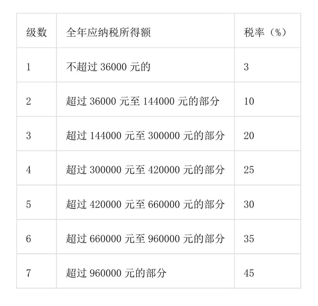 (注1:本表所稱全年應納稅所得額是指依照本法第六條的規(guī)定,居民個人取得綜合所得以每一納稅年度收入額減除費用六萬元以及專項扣除、專項附加扣除和依法確定的其他扣除后的余額。注2:非居民個人取得工資、薪金所得,勞務報酬所得,稿酬所得和特許權使用費所得,依照本表按月?lián)Q算后計算應納稅額。)