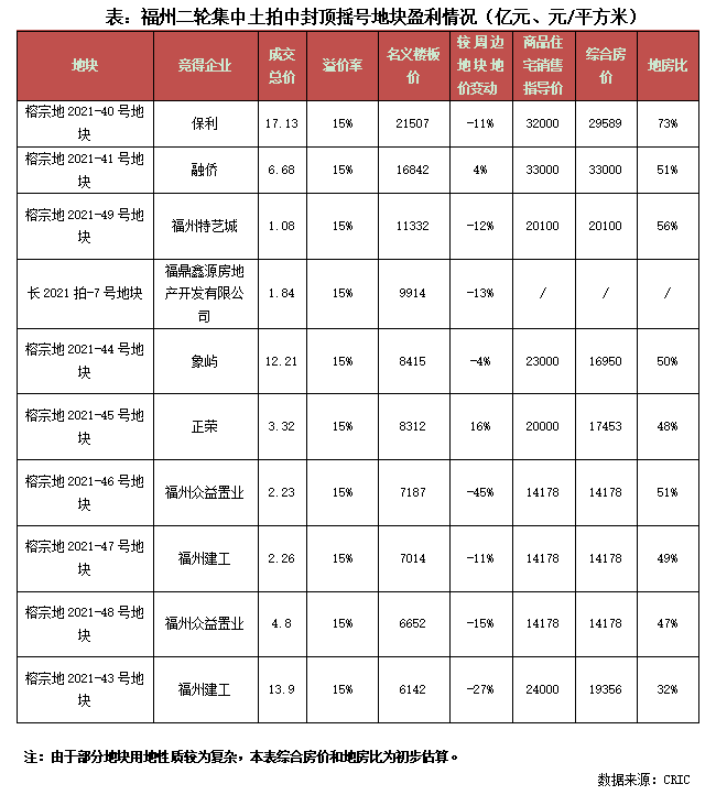 而就盈利情況來看,整體較為可觀。按照綜合指標銷售價來看,除本次土拍最熱門的地塊晉安區紅光村及周邊地塊(榕宗地2021-40號地塊)外,其余9宗封頂成交地塊地房比均在60%以下,尤其是福州建工競得的三江口地塊,地房比僅有32%,房地差過萬元,盈利空間均十分可觀。