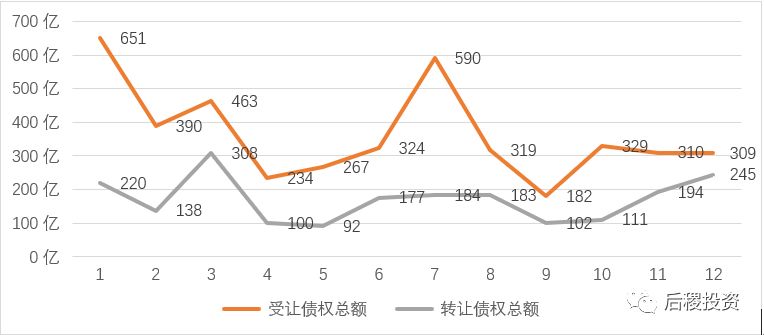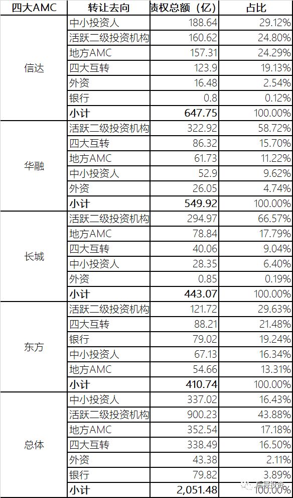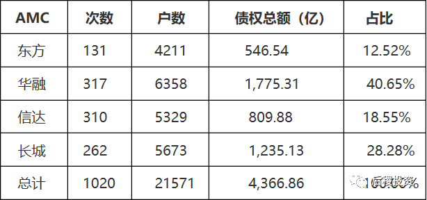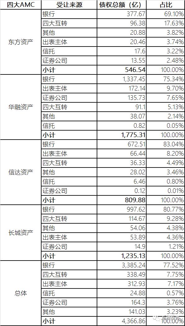 按2018年銀行出讓了4500億債權(quán)計,四大AMC從銀行共受讓了3385億,市場占比為75.2%。此外,四大間相互轉(zhuǎn)讓、銀行常用出表通道再次轉(zhuǎn)讓給四大的情況也不少見。
