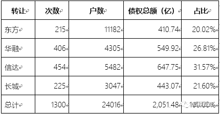 華融資產(chǎn)受讓債權(quán)總額、受讓次數(shù)、戶數(shù)在四大AMC中都排在首位,其中受讓債權(quán)總額占四大AMC的比例高達(dá)40.7%,而東方資產(chǎn)則在這三個指標(biāo)均排在末尾。