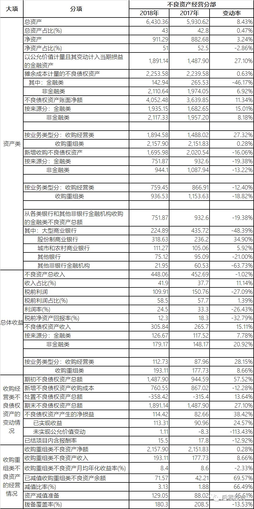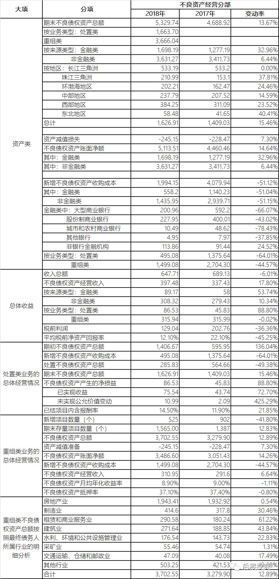 e. 重組類業(yè)務(wù)資產(chǎn)月均年化收益率由9%下調(diào)到8.9%,基本保持穩(wěn)定;重組類資產(chǎn)中,房地產(chǎn)行業(yè)占比高達(dá)52.5%,雖然相較2017年的58.9%有較大幅度的下降,但占比仍然很重,以整個不良債權(quán)資產(chǎn)賬面凈額的5,113.51億為基數(shù),房地產(chǎn)業(yè)務(wù)比重也達(dá)到了38%,在房地產(chǎn)行業(yè)持續(xù)調(diào)控的背景下,未來業(yè)績可能會進(jìn)一步承壓。
