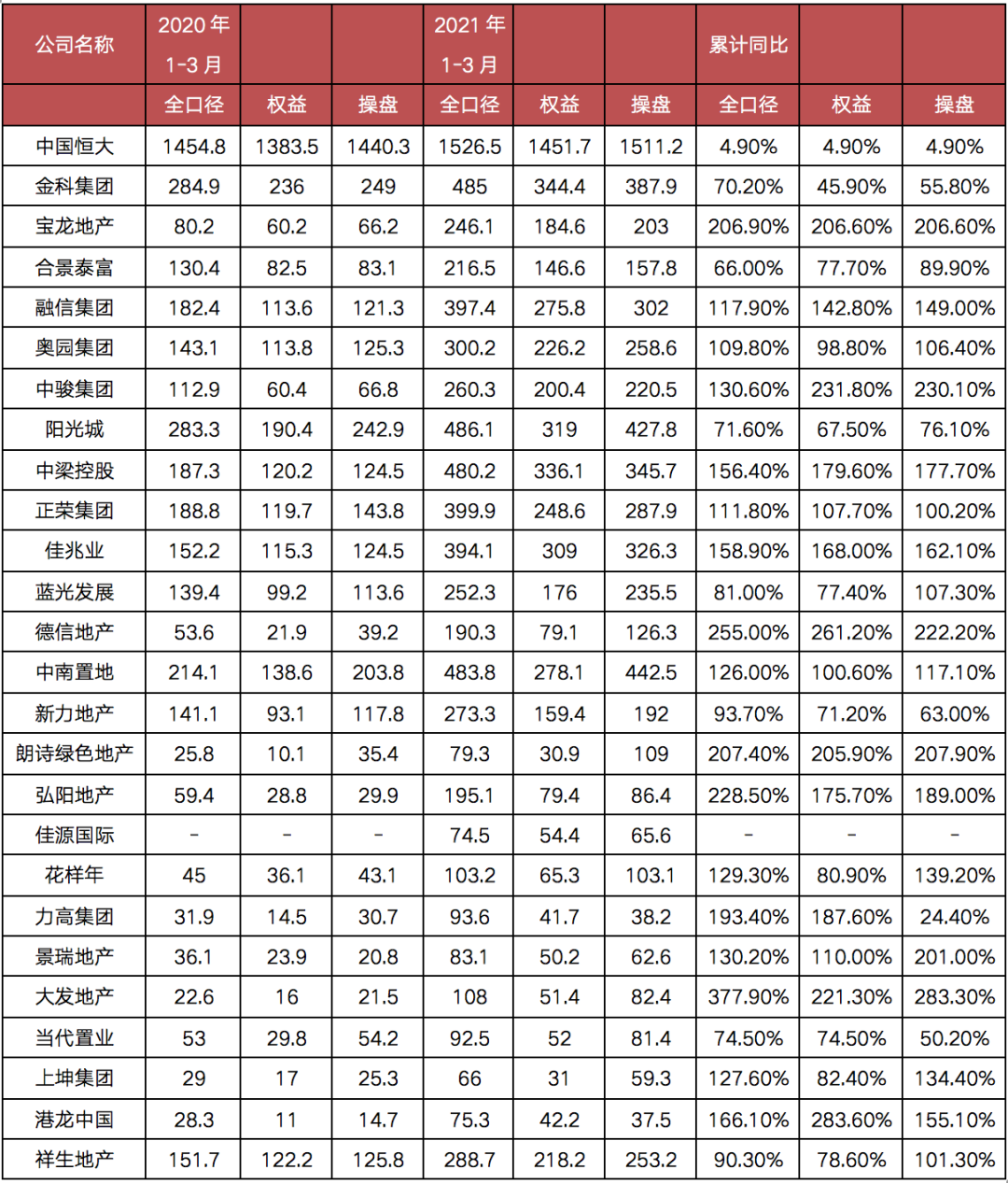 根據克而瑞證券統計數據顯示,2021年1-3月,26家“B”評級及樣本房企全口徑銷售額累計同比增速均值約為139.1%(除恒大),約有三分之二的房企實現銷售翻倍。此外,26家“B”評級及樣本房企權益銷售金額和操盤金額平均漲幅均超過了130%。究其原因,主要是去年同期受疫情沖擊,房地產供應停擺而造成的銷售低基數影響。