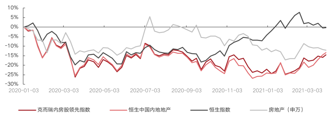 2020年1月1日至3月底,克而瑞內房股領先指數跌幅14.7%,同期恒生中國內地地產指數跌幅13.5%,恒生指數跌幅0.3%,房地產(申萬)板塊跌幅12.2%。