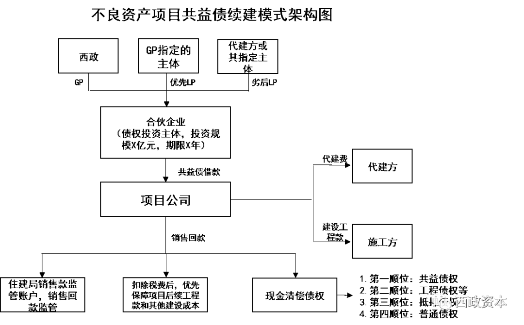 1. 投資架構:西政(GP)及其指定的主體(優先級LP)與代建方或其指定的主體(劣后級LP)共同成立合伙企業,作為不良資產項目的債權投資主體;優先級LP和劣后級LP按7:3的比例出資,總出資額度不超過約定金額。
