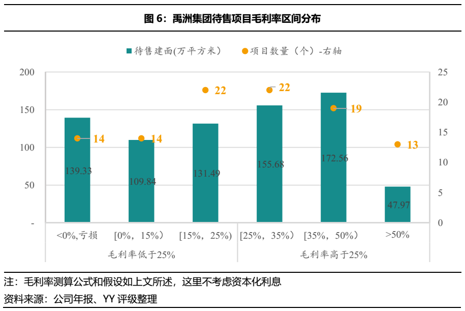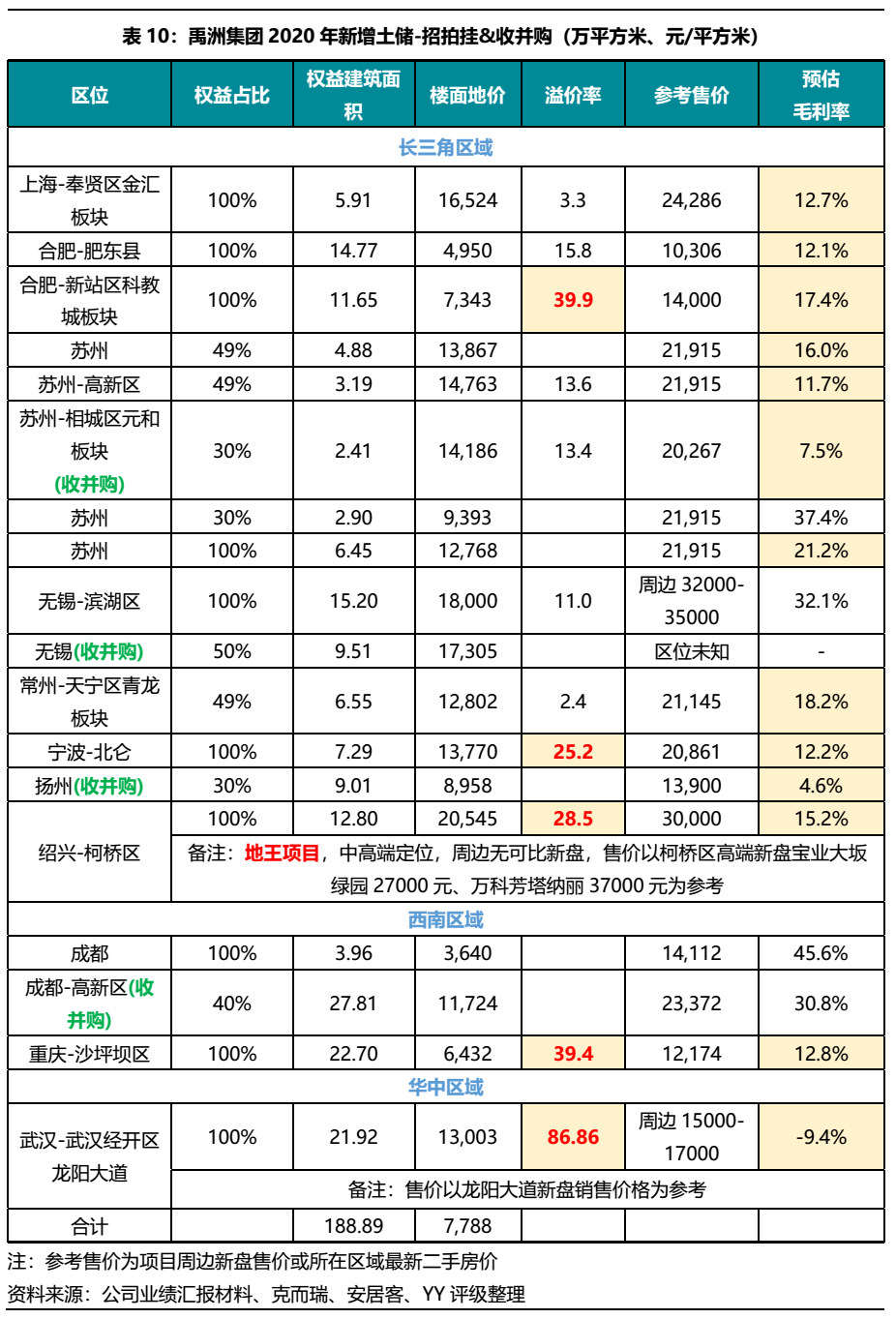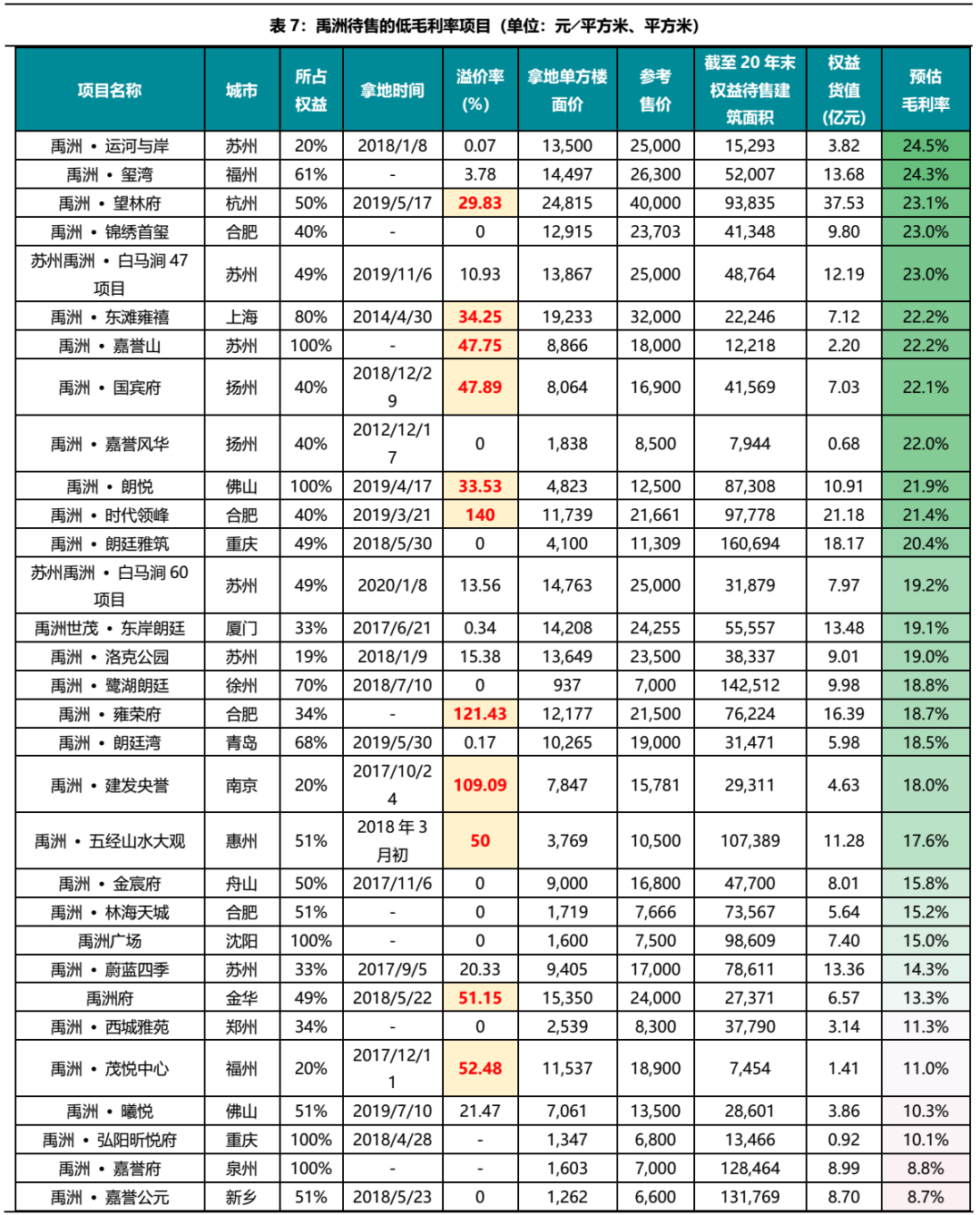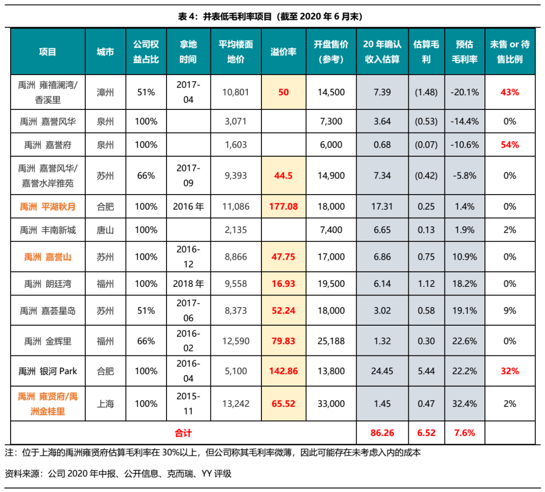 如此簡單估算下來,18個并表項目中有11個項目毛利率不足25%(參見下表),甚至部分項目已然虧損,如漳州的雍禧瀾灣、泉州的嘉譽風華和嘉譽府,以及蘇州的嘉譽風華。公司上述微薄毛利率項目均在其中——合肥的禹洲平湖秋月、蘇州的禹洲嘉譽山、亳州的禹洲名邦狀元府,除此以外,低毛利率項目還包括一些位于福州、蘇州、唐山和合肥的項目。下表項目估算收入合計約86億元,占公司2020年并表營業收入(104億元)的83%;但預估毛利僅有6.5億元,即毛利率僅7.6%,若再考慮土增稅、銷售渠道費用等,則這些項目盈利更為艱難。