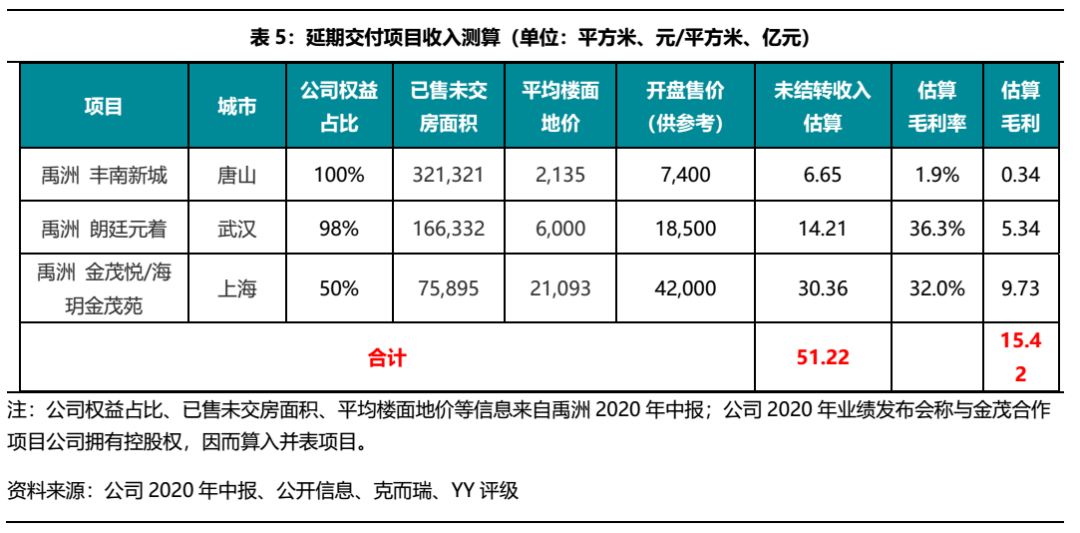 根據公司所述“上海的若干項目的開發進度及于武漢及唐山的項目交付有所延期”,以及“上海項目為與金茂合作項目”等信息,我們在2020年中報中找到如下在建項目,以“已售未交房面積”作為本該于2020年交付但實際延期交付的面積,結合開盤售價信息,估算出未結轉收入合計為51.22億元,毛利15.42億元(若按公司所述三個項目毛利率在25%估算,則未結轉毛利為12.8億元)。作為參考,公司2020年結轉收入較2019年減少128億元,我們的不完全統計可解釋其中的40%。