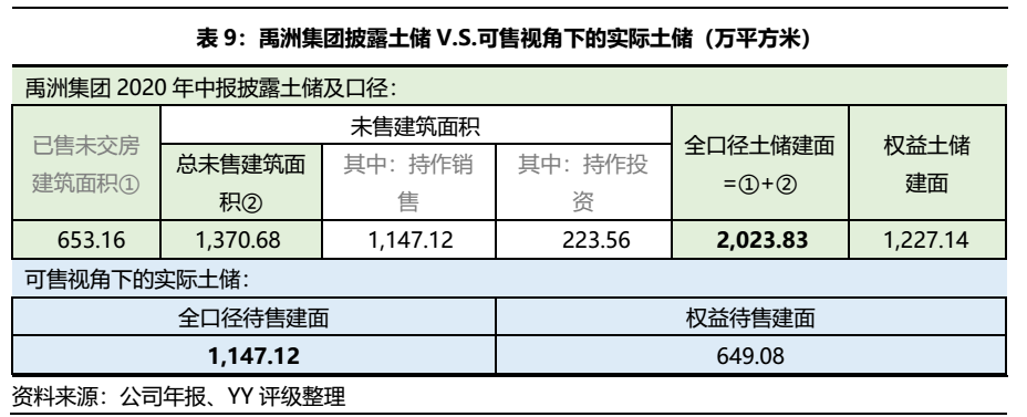 挖掘方法:因房企于資產控制權轉讓至客戶(房屋交付)時確認收入,根據禹洲定期報告對土儲的詳細披露,我們以“已售已交房面積”為切入口,通過對比2020中報的各項目“已售已交房面積”相對于2019年報相同科目的增量,可以得到2020年上半年交房了一部分的項目。這些項目無論是否并表,均體現在2020年利潤表中。