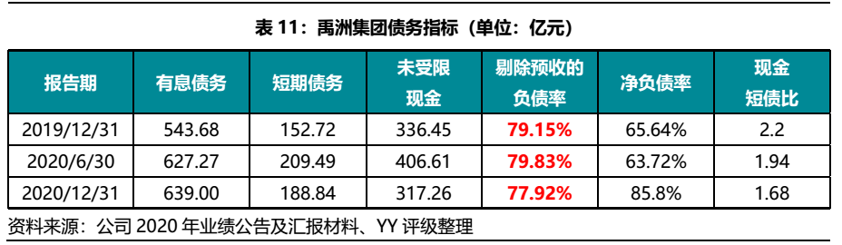 截至2020年末,禹洲集團有息債務總額639億元,其中短期占比約30%。三道紅線指標仍為僅觸碰一條,但正如我們在之前的報告中所揭示,公司合作開發比例較高,以及財務粉飾的動機使得非并表項目的負債具有一定風險敞口。