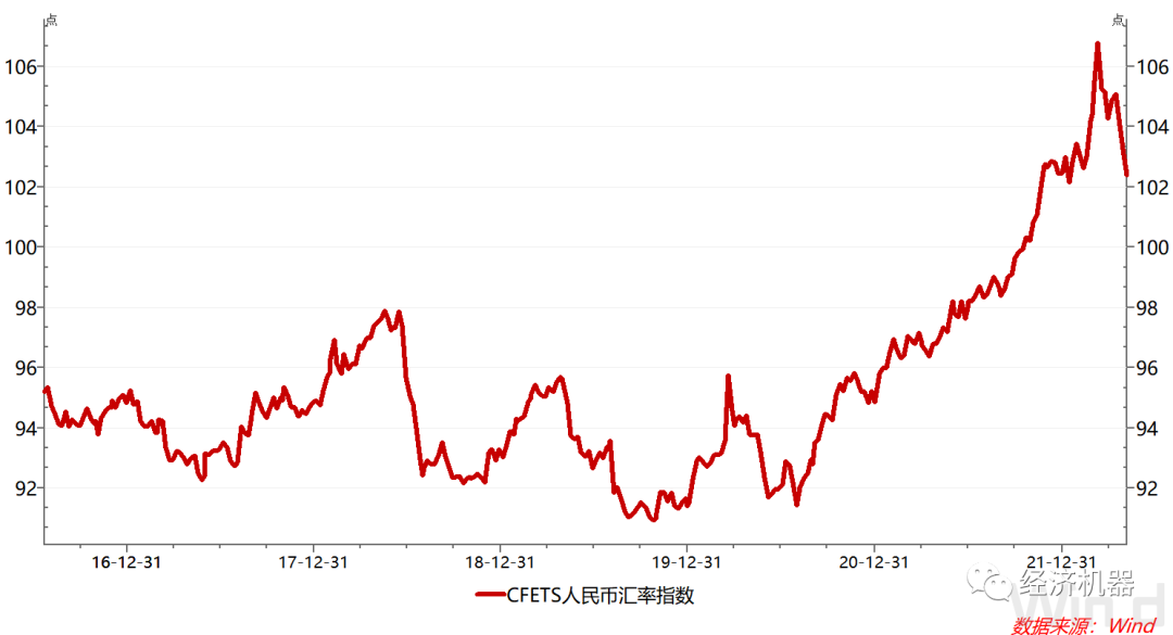 期間,人民幣匯率也表現(xiàn)的十分強(qiáng)勢(shì),2020年以來對(duì)美元持續(xù)升值。CFETS人民幣匯率指數(shù)也由2020年7月的92最高升至2022年3月的106.8,漲幅約16%。