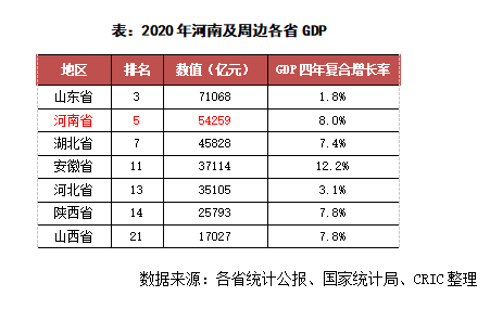 隨著近幾年中原城市群建設(shè)的逐步推進(jìn),河南省城市規(guī)模持續(xù)擴(kuò)大,河南的整體經(jīng)濟(jì)水平穩(wěn)步增長,2020年河南省的GDP水平為54259億元,排名全國第5,排名在周邊6省中位居第二,且四年GDP復(fù)合增速達(dá)到8.0%,在周邊地區(qū)中僅次于安徽省的12.2%,綜合河南省在全國的GDP排名較為靠前這一因素來看,其四年GDP復(fù)合增速在周邊地區(qū)屬于較高水平。