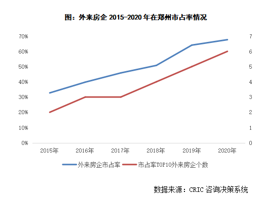 然而,隨著外來房企的進(jìn)入,本土房企的份額正逐年被外來房企蠶食。一方面鄭州市占率TOP1的水平逐年下降,且與第二名的差距逐年縮小,市占率TOP1由2015年的16.0%下降到2020年的9.1%,2015年TOP1的市占率與第二名的差距有6個百分點,而2020年差距則不足1個百分點;另一方面,本土房企在鄭州的銷售占比逐年下滑,由2015年的68%下降到2020年的32%,并且在市占率TOP10的房企中,外來房企個數(shù)逐年上升。