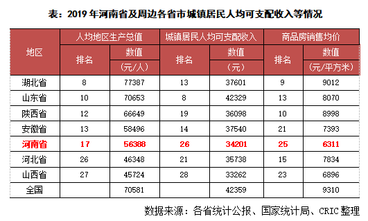 從人均發(fā)展水平來看,2019年河南省人均地區(qū)生產(chǎn)水平56388元/人,全國地區(qū)排名第17,城鎮(zhèn)居民人均可支配收入34201元,排名第26名,在周邊接壤的省份中,人均購買力屬于下游的地位,整體人均購買力較弱。