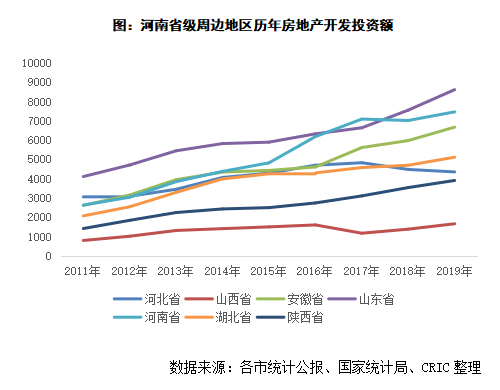從房地產(chǎn)發(fā)展體量上來看,河南省2019年房地產(chǎn)開發(fā)投資額7465億元,全國各地區(qū)排名第五,房地產(chǎn)市場整體體量較大,同時同周邊6個接壤的省份比較來看,河南僅次于山東省,在中部地區(qū)中屬于領(lǐng)先地位。反映到最終的商品房銷售額來看,2019年河南省的商品房銷售額9010億元,全國各地區(qū)排名第六,與周邊接壤的省份相比,僅次于山東省。