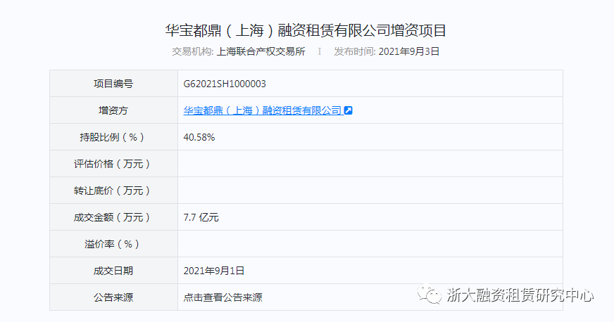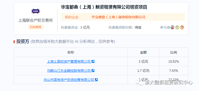 5 | 2021年2月10日 | 華寶都鼎(上海)融資租賃有限公司 | 16億元 | 19億元 | 3 億元 | 擬通過增資擴股引入戰略投資者,目前交易所顯示增資已成交,3家戰投總成交金額為7.7億元。 |