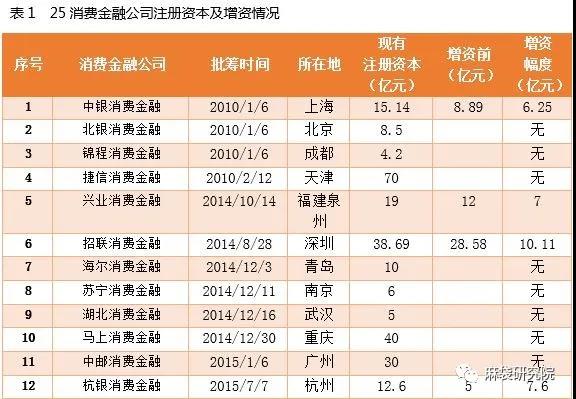25家已開業(yè)消費金融公司、地區(qū)、注冊資本及近期增資情況如表1所示: