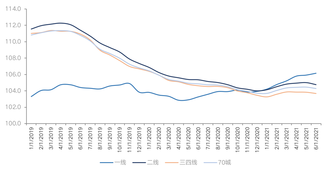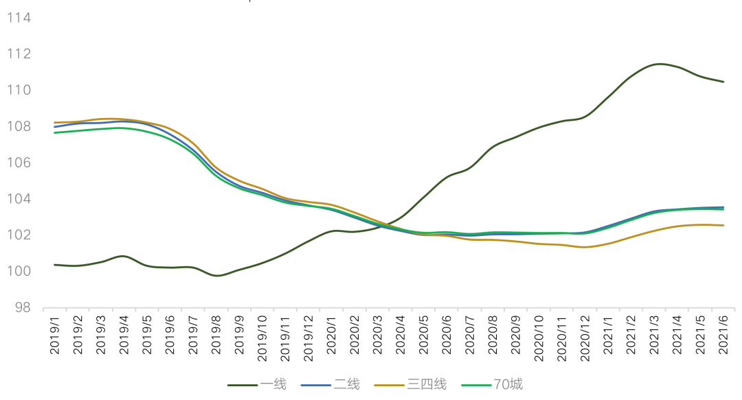 從全國商品房銷售價格來看,2021年6月份,70個大中城市商品住宅銷售價格漲幅整體呈現(xiàn)穩(wěn)中有落的態(tài)勢。