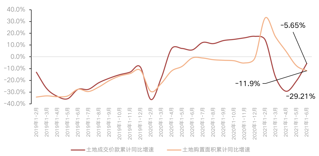值得注意的是,國家統(tǒng)計局?jǐn)?shù)據(jù)顯示,1-6月,房地產(chǎn)開發(fā)企業(yè)土地購置面積7021萬平方米,同比下降11.8%;土地成交價款3808億元,下降5.7%。二者較1-5月降幅分別擴大4.4pts和收窄14.9pts。
