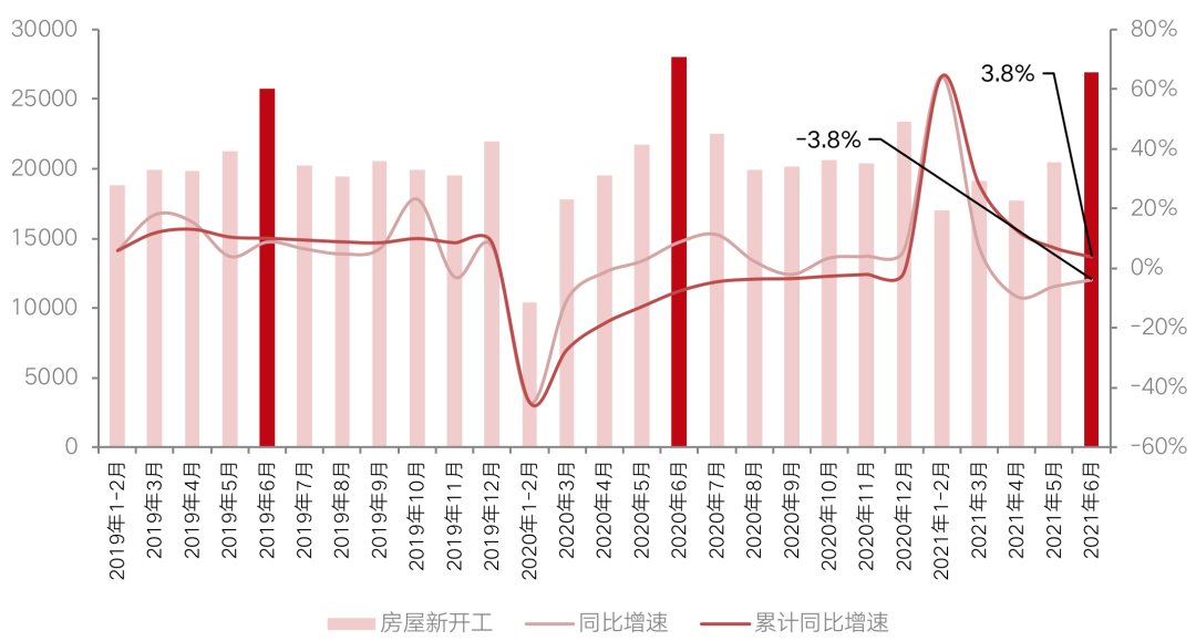 單月來看房屋新開工面積一改上半年頹勢,同比降幅收窄、較2019年回正。6月房屋新開工面積26939萬平方米,雖同比下降3.8%但跌幅收窄2.3pts,且較2019年增長4.7%。規(guī)模上本月新開工面積回歸至歷史較高水平,僅次于2020年疫后年中集中開工。過去一年內(nèi)成交的熱點地塊陸續(xù)開工入市下全國新開工規(guī)模如預(yù)期上升。