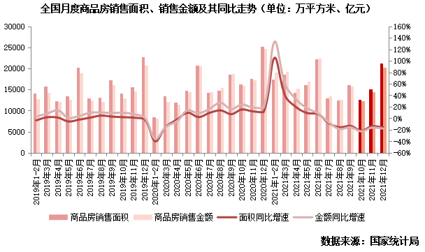 2021年,城市住房需求尤其是改善型住房需求穩步釋放,房地產業增加值比上年增長5.2%,拉動整體經濟增長0.4個百分點。但下半年新開工、土地購置和開發投資均降至冰點,“以價換量”和信貸寬松給予了年末市場一定“數據繁榮”。但本輪信貸、融資、土地等各方面調控暴露出一大部分城市已存在較大購買力透支問題,短期行業仍將面臨繼續下行壓力,各地區銷售分化和降價效用邊際遞減將繼續保持,預計商品房銷售規模在今年一季度仍將下調筑底過程中。