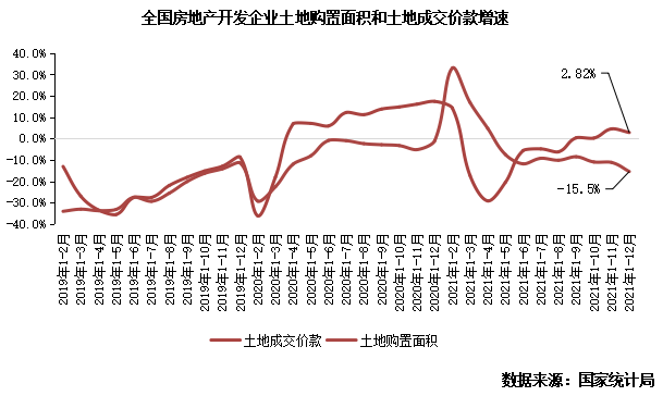 據國家統計局數據:2021年,房地產開發企業土地購置面積2.2億平方米,比上年下降15.5%;土地成交價款1.8萬億元,增長2.8%。單月土地購置面積和成交價款分別為3303萬平方米和3237億元,同比分別下降33%和4%。土地市場已經進入到了冰點。房地產資金面收到嚴控下,民營開發企業多已無力購置土地,受此影響下土拓投資已難再支撐整體行業投資規模。