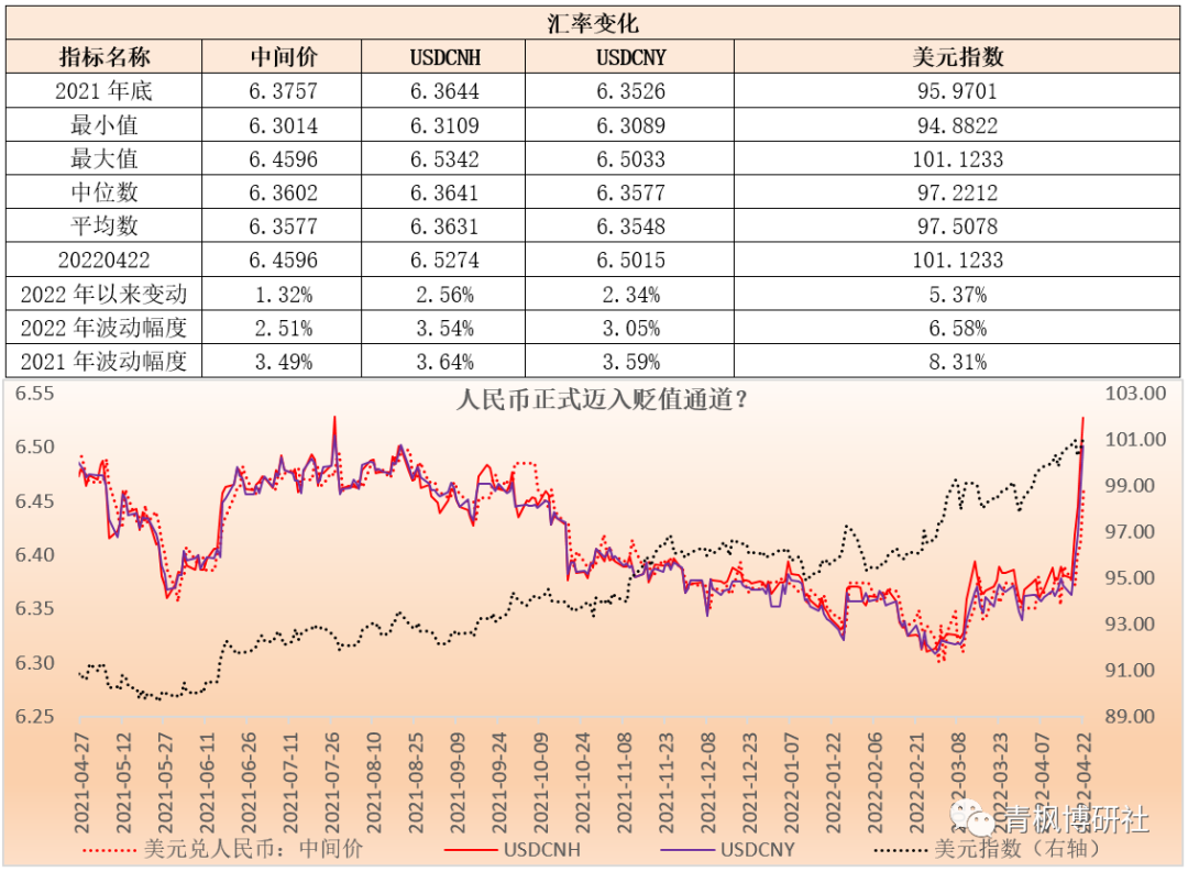 經過2021年11月以來長達四個多月的平靜期后,人民幣自2022年3月以來開始進入趨勢性貶值的格局,貶值壓力終于得到一定程度的釋放,僅本周一周貶值幅度便走過2%,離岸人民幣期間一度貶值6.5346。