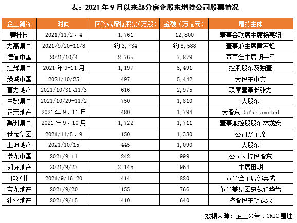 除了提前贖回部分境外債之外,9月以來多家房企大股東增持公司股票,進行市值維護,增添市場信心。據不完全統計,2021年9月以來,就有17家房企的大股東等通過對公司股票進行增持。其中碧桂園楊惠妍在11月累計增持碧桂園股票不小于1761萬股,金額1.28億元,力高集團黃若虹自9月20日起累計增持約3734萬股,持股比例由29.49%上升到40.0%。