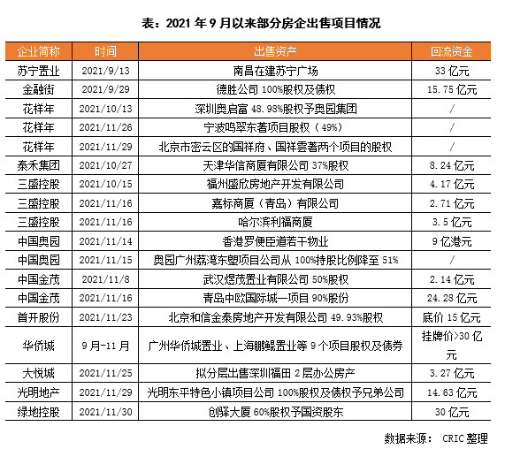除了市場信心維穩之外,面臨現金流緊繃,房企也積極進行出售項目或者旗下資產回流現金,增補現金流,提升抵御市場不確定性風險的綜合能力。進行出售的資產,包括自有開發項目,如三盛控股出售福州、青島、哈爾濱等地的項目和商廈,收回現金10.38億元;中國金茂近期轉讓青島和武漢項目公司的股權,擬回流現金26.42億元,不過金茂并未全部轉出,保留了部分的股權。同時,部分企業將資產出售予大股東,進行現金回流,如光明地產和綠地控股分別將特色小鎮項目公司股權與創驛大廈的60%股權,分別回流14.63億元和30億元。