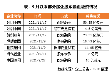 除了進行股票增持的操作,部分股東還為企業提供股東借款融資,據不完全統計,融資主要集中在股東借款、配股融資、抵押物業借款等,除了提振市場信心,也為公司注入資金,增強企業流動性。當代置業、融創中國的股東分別為公司提供了8億元、4.5億美元的股東借款。而旭輝集團發布公告稱,以供股的方式發行最多約4.18億新股,募集約16.73億港元,大股東林氏家族承諾將投入8.87億港元認購2.22億股,并有意向額外投入最多7.86億港元進行全額認購,合計將最多投入16.73億港元用于助力公司的長期發展,以股東兜底的方式進行融資。而融創中國、中國奧園則進行了配股融資,其中融創募集金額達到50.85億港元。值得注意的是,股東借款及配股融資等方式,對股東以及企業自身發展前景要求較高,目前僅有少量房企進行。