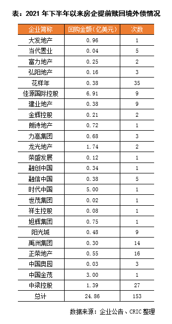 據不完全統計,2021年下半年以來,不少于24家房企陸續實行境外債提前回購舉動,回購次數超過153次,提前回購境外債券及票據涉及資金合計24.86億美元,債券到期時間橫跨2021年到2026年,不少房企十月以后加大了2022年到期債務的提前贖回,減輕明年的還款壓力。就企業表現來看,中梁控股、正榮地產、禹洲集團、花樣年等回購次數相對較多,佳源國際、中國金茂、中梁控股、龍光等贖回金額超過1億美元。房企進行債券回購除了維穩市場信心之外,也因當前債券價格相對便宜,以低折扣進行回購實則比到期兌付更為劃算。