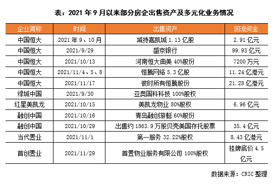 除了商廈、開發項目等資產,企業還進行多元化業務的出售。物業公司作為“現金奶牛”素來有較高的估值,進行現金回流的速度相對較高,成為部分房企考慮出售的多元化資產之一,今年以來,藍光、富力、當代、紅星美凱龍等企業完成了其旗下物業公司的出售,回流現金。此外,部分企業也出售了對外投資企業的股份,如融創出售約1863.9萬股貝殼美國存托股票,回流金額約35.4億元,恒大母公司廣州凱隆減持嘉凱城1.13億股,收回現金2.91億元。也有部分企業聚焦主業,出售旗下其他多元化業務,如融創、綠城分別出售了部分游艇及科技業務。