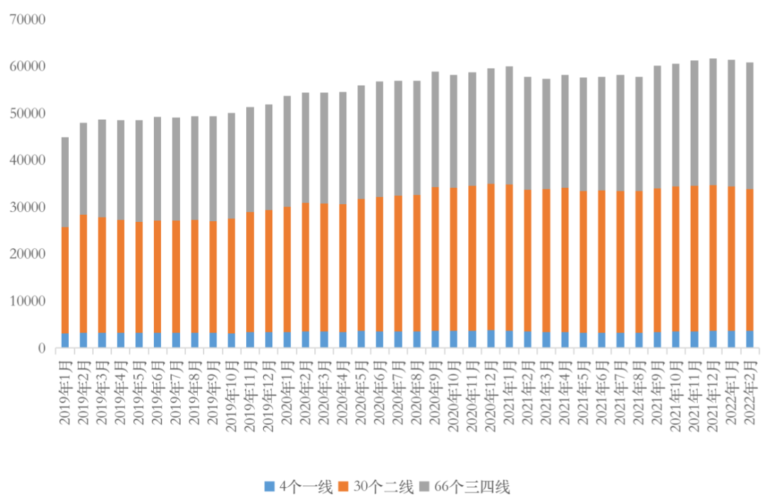 二線城市中,多數城市庫存量與上月相比變動不大,漲跌幅均在5%以內,而北部和內陸城市諸如青島、沈陽、武漢2月末狹義庫存量均超2000萬平方米,位列本月末狹義庫存總量TOP3。