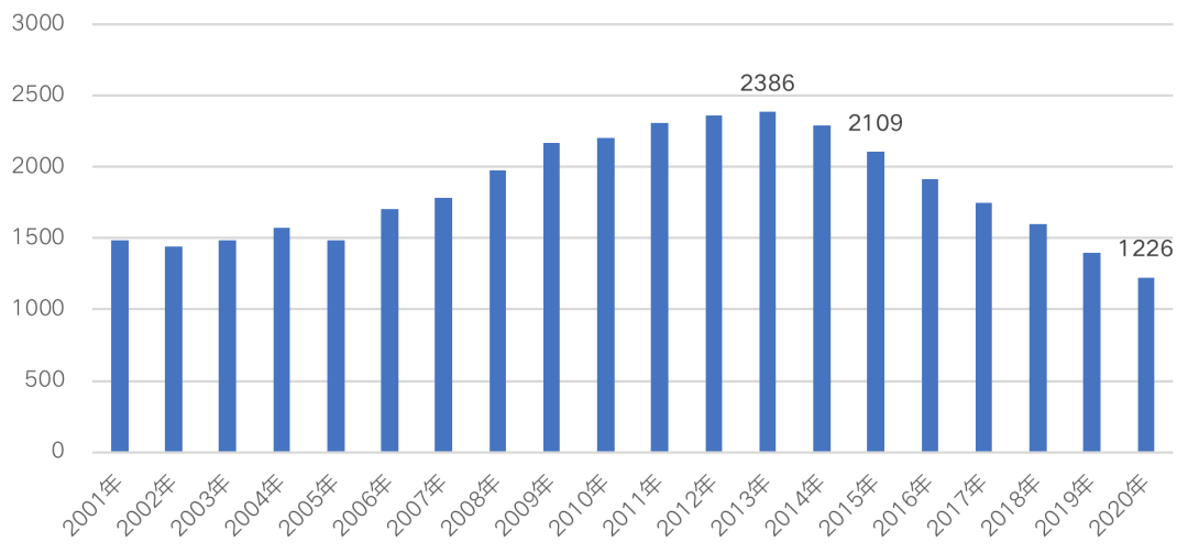 2001年-2020年內(nèi)地居民初婚登記人數(shù)顯示,2013年以后我國(guó)的初婚人數(shù)便呈現(xiàn)出明顯的下降趨勢(shì),近五年年均減少量接近180萬(wàn);截止至2020年末,全國(guó)內(nèi)地初婚人數(shù)僅有1226萬(wàn)人,較五年前減少了四成多。