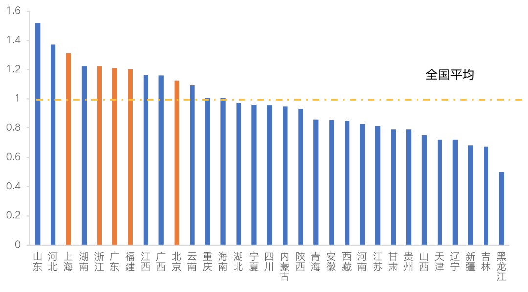 因此,為了進(jìn)一步探知這些外來(lái)人口規(guī)模大的城市常住和戶籍人口的婚房需求差異,我們結(jié)合這些城市的常住人口出生量,并與初婚登記人數(shù)進(jìn)行對(duì)比。以出生初婚人口比(常住出生人數(shù)/近兩年初婚登記對(duì)數(shù))指標(biāo)來(lái)看,山東、河北、上海等13個(gè)省市的出生初婚比高于全國(guó)平均水平。
