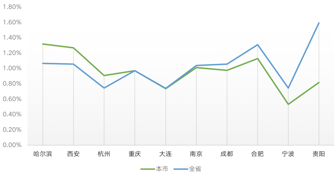 從部分人口凈流入的典型熱門城市來(lái)看,和省內(nèi)平均水平相比,大部分城市的初婚率都低于全省平均水平,僅哈爾濱、西安、杭州等少數(shù)城市的初婚率高于全省平均水平,其中哈爾濱的初婚率達(dá)1.32%,高于全省平均水平0.25個(gè)百分點(diǎn)。