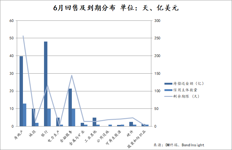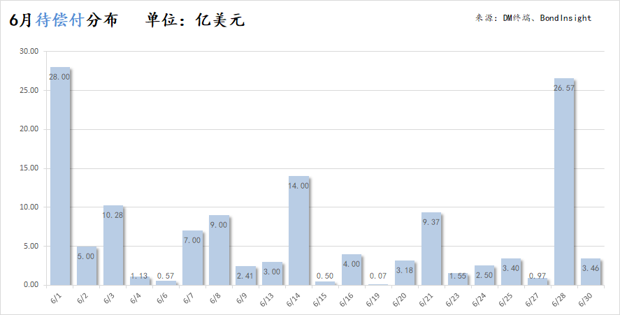 從時間分布上看,償債壓力在6月集中在頭、尾部,分別在6月1日及6月28日出現兩波兌付高峰。其中6月1日單日有4筆債券面臨回售或到期兌付,涉及金額高達28億美元,為本月單日最高待還金額;單日最多筆數則是6月28日,共計5筆債項需兌付。