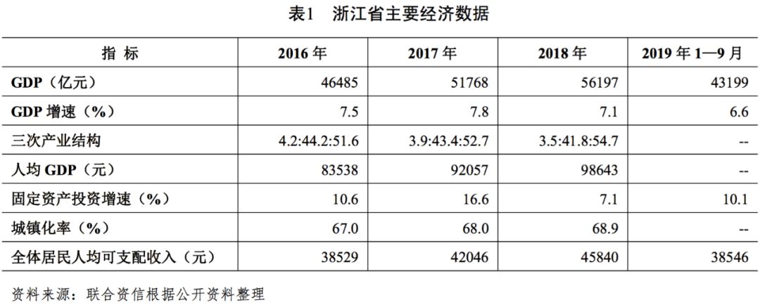 浙江省地處東南沿海,經濟發展處于全國領先水平,GDP及增速連續多年位居全國第四位;產業結構以第三產業為主,民營經濟活躍度較高,固定資產投資增速2018年有所放緩,居民可支配收入及城鎮化率均處于全國較高水平。