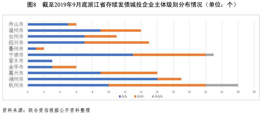 浙江省發債城投企業數量較多,以區縣級城投為主,地區分布上則以杭州市、寧波市等經濟發達地區為主;發債城投企業的主體信用級別整體較高。