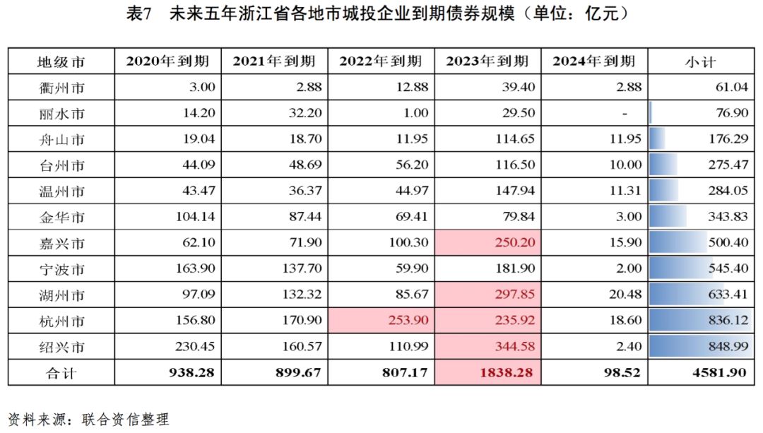 從各地市城投企業存量債券集中償付壓力看,嘉興市、湖州市、紹興市、溫州市和舟山市城投企業存量債券集中兌付壓力較大,均將于2023年達到兌付高峰,當年分別需償還250.20億元、297.85億元、344.58億元、147.94億元和114.65億元,其中紹興市于2020年亦存在一定集中兌付壓力,當年需償還債務總額230.45億元;其余地市城投企業存量債券集中兌付壓力相對較小;但杭州市城投企業存量債券余額較大,在2022—2023年到期債務規模較高。