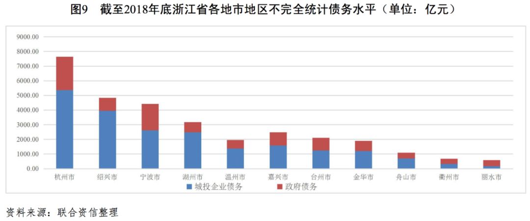 城投企業作為地方基礎設施尤其是公益性項目的投資建設主體,其自身造血能力不足,日常經營運轉以及債務償還對地方政府有很強的依賴。本文對浙江省城投企業債務風險分析,主要從地方政府對轄區內發債城投企業有息債務保障支持能力等方面展開分析。考慮到發債城投企業的有息債務在一定意義上為政府隱性債務,本文用地區不完全統計債務來衡量浙江省各地市債務水平。