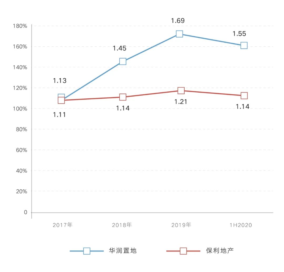 過去,頭部房企在規模化擴張過程中,傾向于借助預收賬款撬動企業經營杠桿,以達到滿足經濟資金需求和優化財務指標的目的,以華潤、保利為例,近年來預售賬款債務比持續提升,一定程度上達到了財務杠桿穩健的目標。