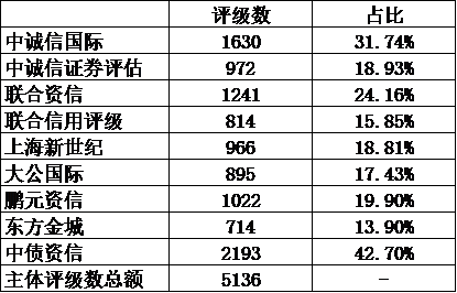 除了“主動評級”的中債資信,中誠信國際的市場占有率最高,超3成發債主體正在或使用過中誠信評級,聯合資信位居第二,大公國際因被暫停業務一年排名下落,鵬元資信、上海新世紀等相差不大,東方金誠位列最后,以及忽略占比太小的上海遠東。