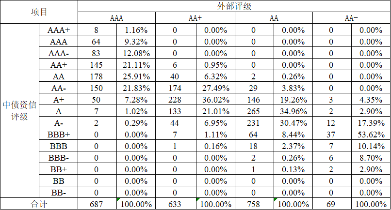此外,外部評級的AA+,普遍集中于中債資信的[AA-,A],外部評級的AA,普遍集中于中債資信的[A+,A-]。